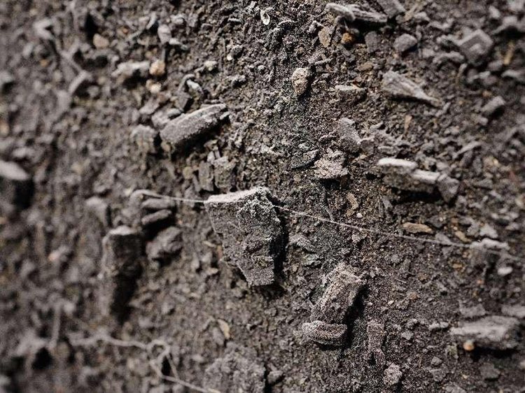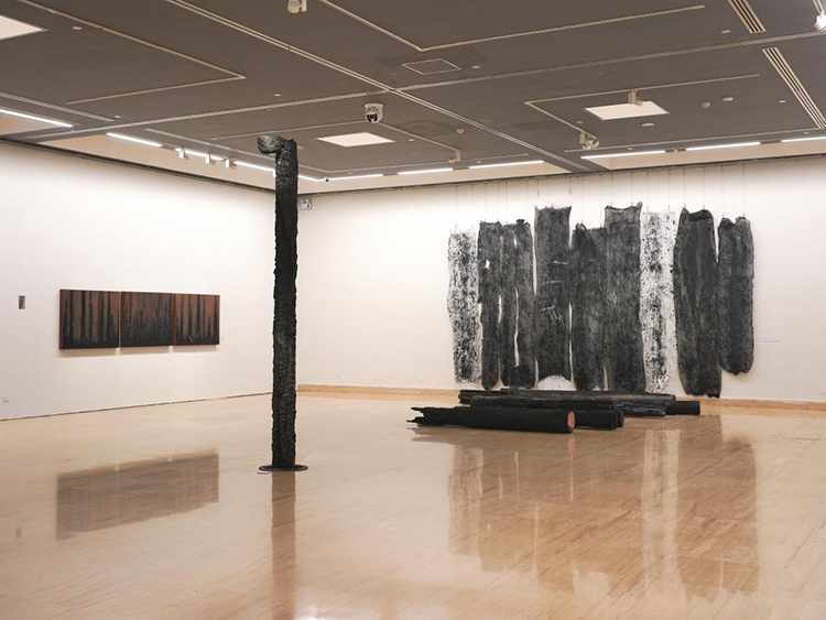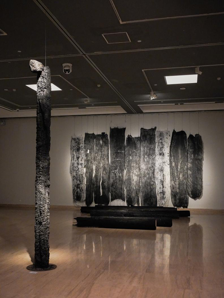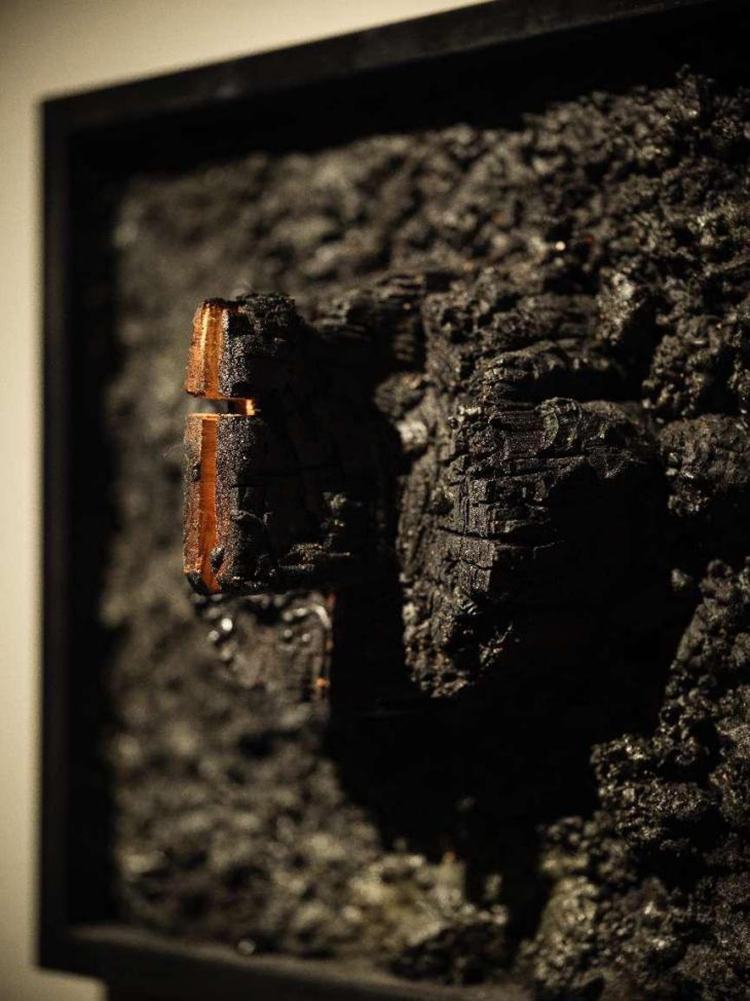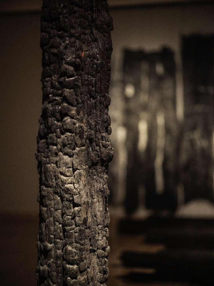 其作品兼具了现代性创伤的文化疗愈。城隍庙作为民间信仰的载体,其毁灭象征传统文化在现代化进程中的边缘化。梅法钗通过焦木的再创作,将废墟转化为“文化考古”的现场,如《烬·系列1》以布面拼贴炭木碎片,形成历史档案般的视觉结构。这种创作方式与德国艺术家安塞姆·基弗(Anselm Kiefer)对战争废墟的反思异曲同工,但梅法钗更强调本土文化基因的延续性,试图在物质废墟中重建精神家园。梅法钗的焦炭承载着具体的地方文化记忆,具有叙事性与象征性,以及“物与空间”的关系。