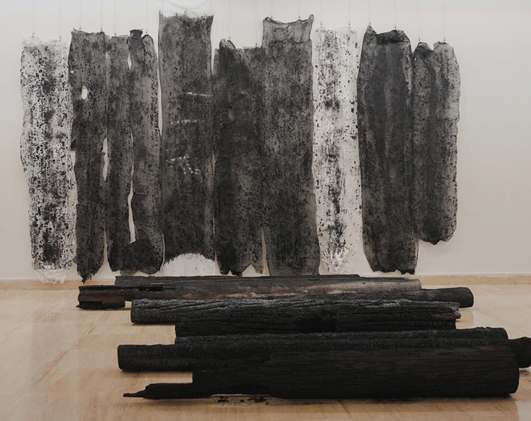 梅法钗的作品可视为中国当代艺术对现代性危机的回应,其思想根源可从两条路径切入:首先,其作品作为禅宗哲学的当代转译,“烬”系列中炭木的寂灭意象与禅宗“无常观”深度契合。《烬系列1》不同形色的布悬置状态,是文化断裂的悬置,也是生命状态的虚空,通过装置材料的“空性”引导观者参透“诸行无常”的终极命题。这种对“空”的诠释,不同于西方极简主义的冷峻形式,而是融入东方禅意的静观与顿悟。