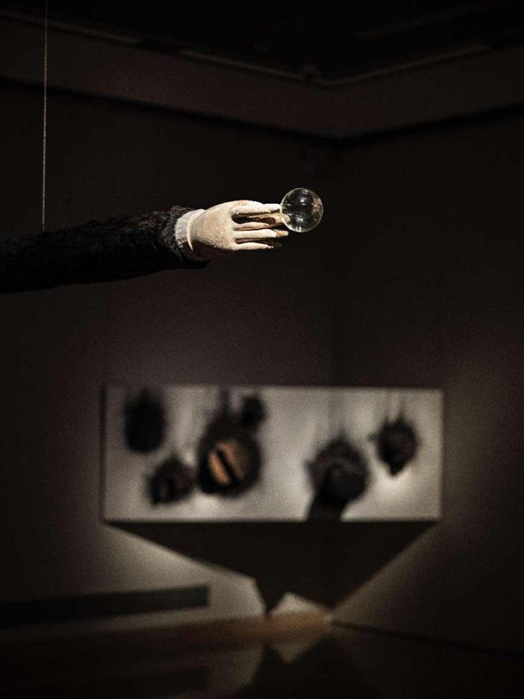 梅法钗的“烬”系列作品焦炭化的手臂作为主体,是物质衰变的终极形态——木材经火灾后碳化的残骸,既保留着原始有机生命的形态轮廓,又因高温灼烧而凝固为无机物的“死亡标本”。焦炭的黑色肌理、粗糙质地与脆弱结构,暗示着历史创伤(如台州城隍庙火灾)、个体生命消逝(如母亲病重)等现实层面的断裂。而玻璃球的光滑表面、透明质感与折射出的斑斓色彩,则与焦炭形成尖锐对立:玻璃作为工业化产物,其熔融重生的物理特性(高温下液态流动,冷却后固态定型)隐喻着涅槃的可能性;球体本身的几何完美性又暗含宇宙秩序与精神永恒的象征。