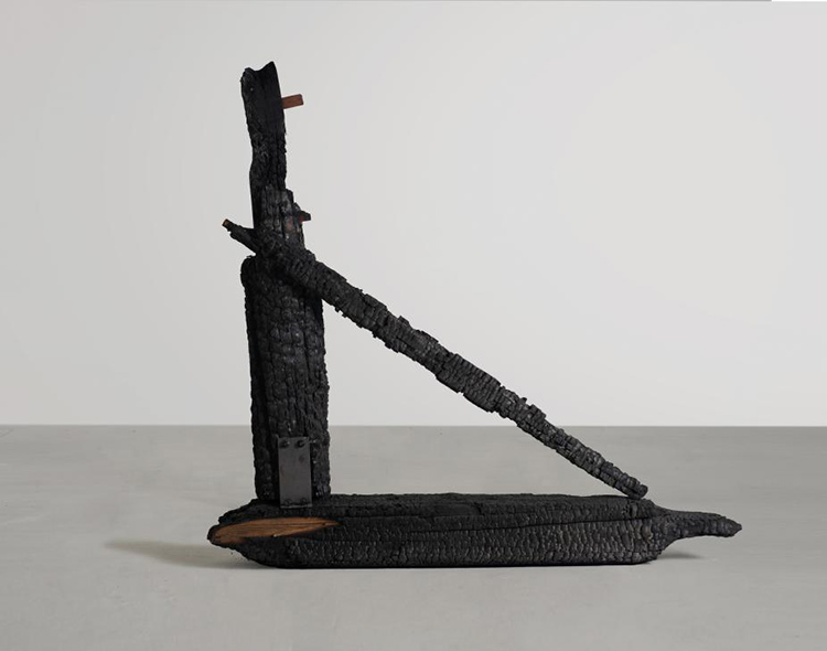 艺术家梅法钗早期作品从寻觅一件废弃了的干枯木头开始,经过斧劈打磨,把自己的情感融入斧劈与刀痕之中,或抽离概括造型,或粗糙表象古朴精神内核向内关照,呈现生命的诞生、毁灭、超越而涅槃重生。形成作品的叙事与抽象的诗意。近期梅法钗的由文化记忆与生命经历,重在个体对社会及其众生的敏锐性表达。这些作品采用他老家台州一座遭受火灾而倒塌的城隍庙古建筑的废墟,炭黑的焦木构成的场域深含历史哲思与人文关怀,述说着人文的脆弱,参透寂灭的意蕴。从而平静、紧张、焦虑等等共同成为艺术家复杂的生命状态,也是艺术家创造性的的成果。因其脱离、超越了西方抽象艺术的形式主义。燃烧后的焦炭、沙石、墨色形成打破理性原则,注入偶然的、激情的,以及情感的要素。构成作品与宏观的历史纵深,以及与不断变幻的现实之间混杂关系。