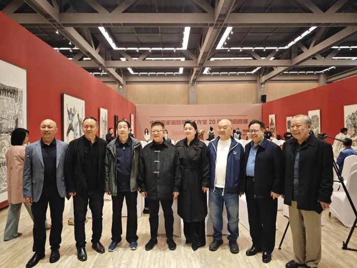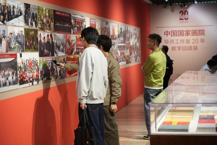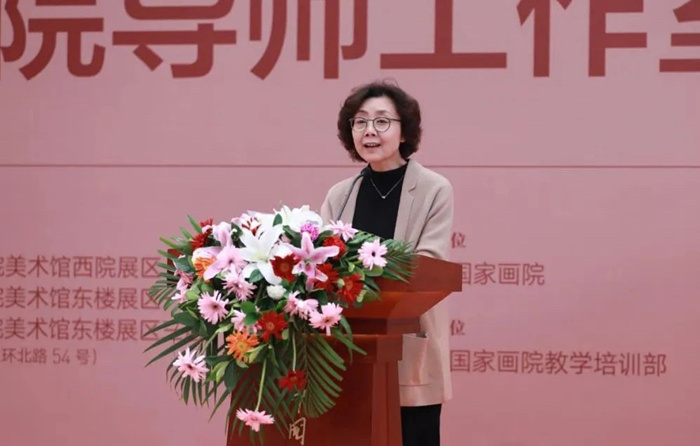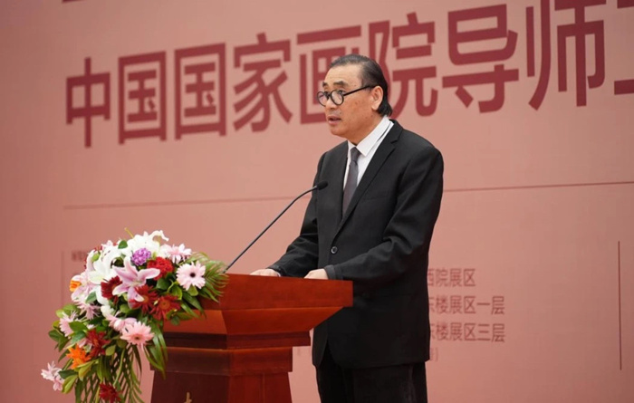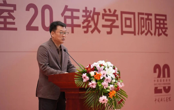 邱雷回顾了中国国家画院开创性地建立导师工作室制这一独具特色的艺术人才培养模式的历程,并谈道,本次教学回顾展自2月份开始面向历届导师工作室全体导师和学员进行作品征集,得到了积极反馈,共有百余位导师参加了此次展览;收到学员投稿作品千余件,经过专家评审组的初评、复评,最终甄选学员作品近400件。此次展览分为三个展区,清晰展现了中国国家画院导师工作室20年的师承脉络和发展演变,集中陈列了历年导师工作室授课的教学文献,是中国国家画院导师工作室20年教学成绩的一个缩影。我们将继续坚持以人民为中心的服务导向,以艺载道、以美铸魂,为新时代中国美术事业培养更多优秀人才,为传承中华优秀传统文化而不懈探索。