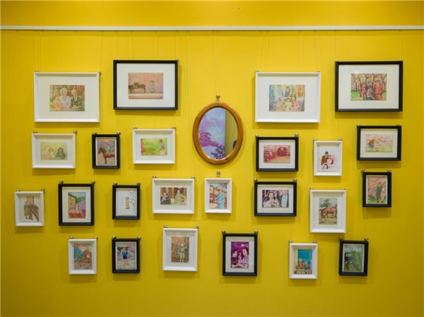 展览分为两部分展开。第一部分为一系列小尺幅油画,素材源于她在英国各地旧货市场收集的二手家庭照片。这些人物形象并非被完全抹去,而是面部特征被刻意模糊与柔化,使个体身份被抽离,却依旧保有强烈的情感张力。画作以家庭客厅常见的“照片墙”形式密集挂于一面温暖的黄色墙上,营造出熟悉而又陌生的氛围。展厅整体采用柔和的黄色基调,这种色彩选择既暗示了“家”的温馨,也隐含着对空间与身份的疏离。在画面中心,一面镜子悄然悬挂,并非用于映照观众,而是让观看本身成为被观看的对象。在这个空间中,记忆获得空间性维度:观者不再是外部的旁观者,而被邀请进入一个编织了缺席与想象的记忆场域。
