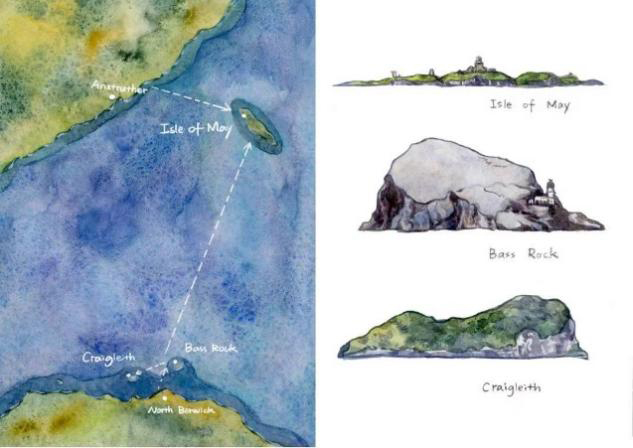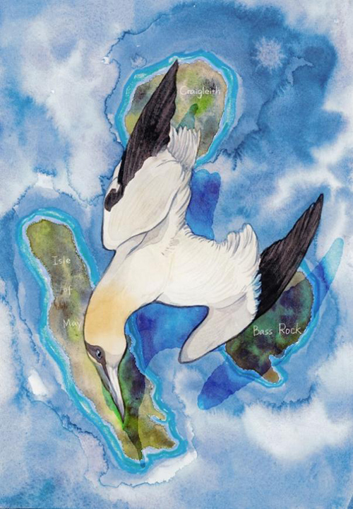 她的色彩倾向清淡克制,不追求过度渲染或戏剧性的高饱和度对比,而更注重光影、透明度和肌理变化所带来的空间感。比如她在描绘塘鹅的经典俯冲捕猎姿势时,会故意将背景虚化成雾状的灰蓝调,使主体显得轻盈又具穿透力,用和清淡的水彩完全相反的浓郁蜡笔笔触来勾勒塘鹅的主要栖息地,形成动与静,实与虚的诗性对比。这种敏感的视觉节奏,既源自长期的野外写生经验,也反映出她将情绪融入自然观测理性结果的能力。