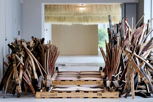 使用崃州蒸馏厂威士忌木桶盖及废拼板搭建的木桥所连接的两个展厅