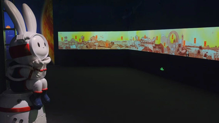 展览的核心展区,一幅长达20米的动态长卷《神州共月》吸引观众的目光。由GEEKSART极客艺术团队创作,该作品首次实现了航天科技与数字艺术的深度融合。画卷以“千里江山图”为灵感,结合手绘、水墨、投影与互动技术,生动描绘了中国34个省级行政区在探月工程中的贡献。