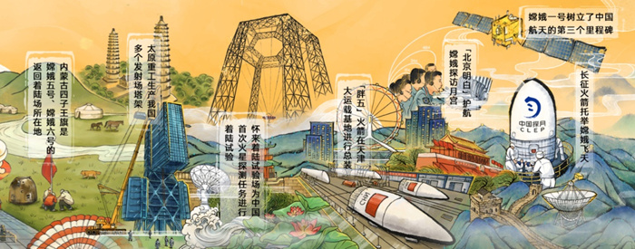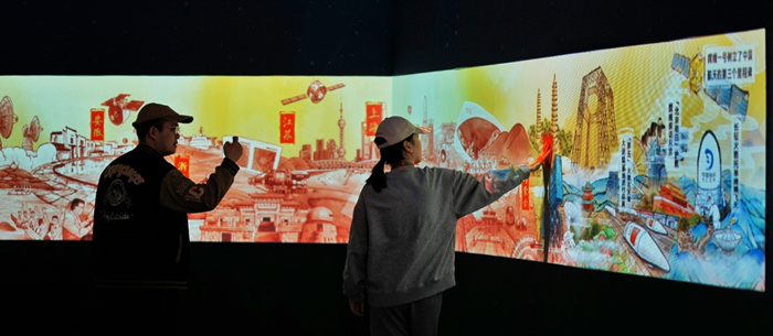 在三折展墙构成的数字剧场中,传统水墨技法与现代投影技术完成了一场惊世合璧。《神州共月》精选文化与科技地标,生动描绘中华儿女以举国之力托举探月梦想的壮阔场景。观众可通过触摸互动,点亮每一处地标背后的故事,沉浸式感受亿万人民托举嫦娥飞天的磅礴力量。