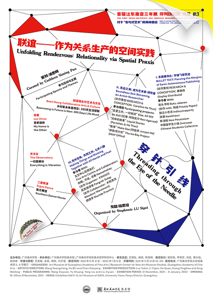 《首届泛东南亚三年展序列研究展项目3: 对于“参与式艺术”的两种回应》海报,展览旨在探讨东南亚艺术在“参与式艺术”这一领域的多元发展路径,也为观众提供了一个深入了解东南亚在国际交流与本土特色中的展示窗口。