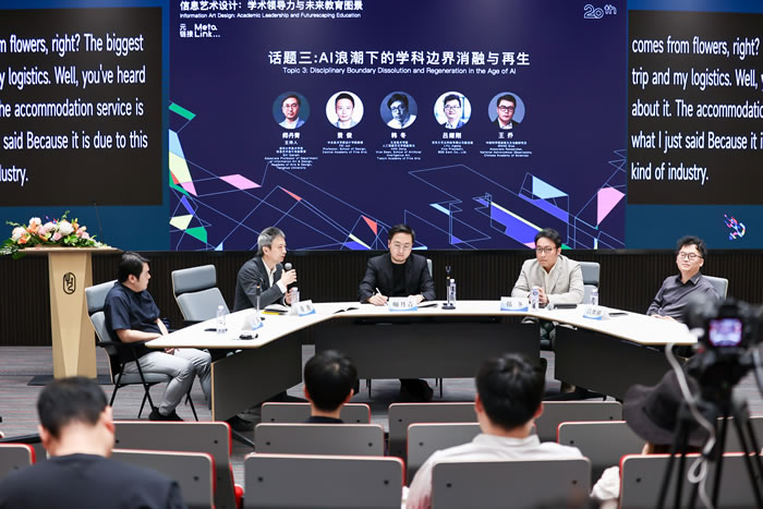 当天下午,“信息艺术设计:学术领导力与未来教育图景”学术研讨会在清华美院C528报告厅举行。相关院校的院长及专家们围绕“信息艺术设计的学科基因与共生演进”“信息艺术设计的育人逻辑与价值锚点”“AI浪潮下的学科边界消融与再生点”等议题展开了深入交流。清华美院教授吴琼、信息艺术设计系主任王之纲、院长助理师丹青分别主持了研讨会的讨论议题。