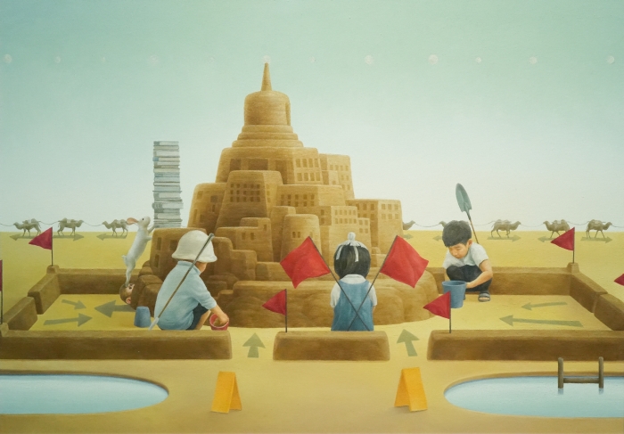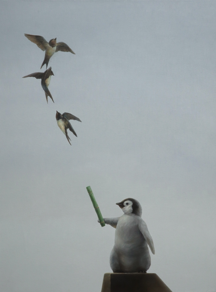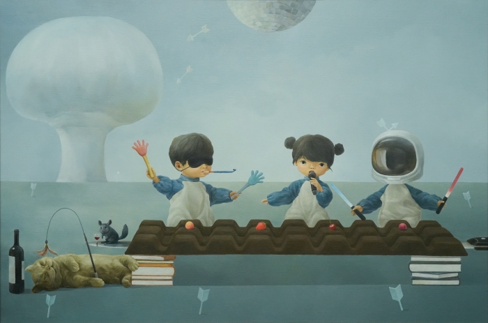源于设计学的学习背景,张永飞的画面中充满对细节的反复斟酌与试验,物象的搭配和场景的组合均是精心谋划的巧思。他擅长运用细致的笔触凸显平面性,画作被赋予静谧而深邃的质感;画中背景常选用近乎单色调描绘,但当仔细观看时,却发现相近的颜色之间流露出耐人寻味的层次感。由此,整个画面营造出一种神秘内敛的氛围,引发观者的无限遐想。