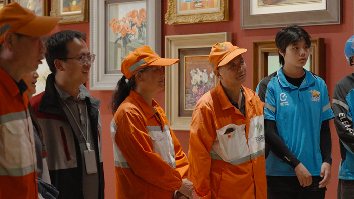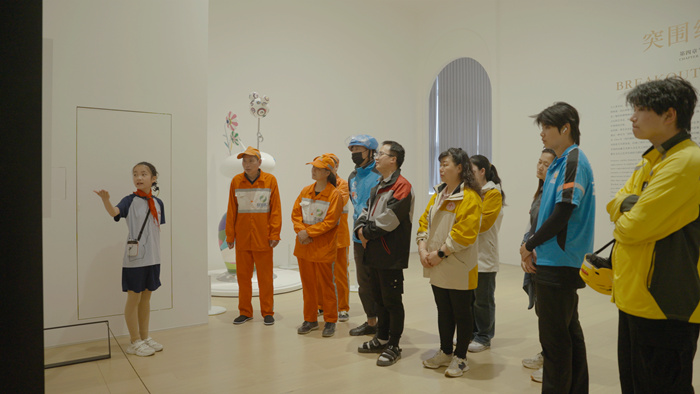 活动当天,德基艺术博物馆迎来了一批特殊的工作人员——来自南京市洪武北路小学的“红领巾讲解员”,以清澈的声线、自信的气魄、丰富的知识储备,为受邀来到现场参观的外卖员、快递员、环卫工人等新就业群体带来了一场生动而专业的展览讲解。