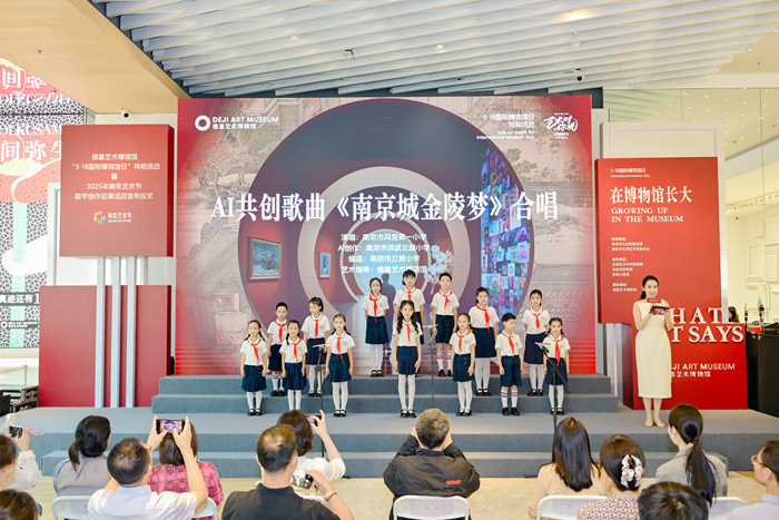 活动现场奏响了一曲关于城市记忆与共创精神的动人乐章——由南京市洪武北路小学AI创作、南京市立贤小学学生编曲、南京市月苑第一小学学生演唱、德基艺术博物馆指导的AI共创歌曲《南京城,金陵梦》(City of Nanjing, Dream of Jinling),以清澈童声与科技赋能的奇妙碰撞,将秦淮河的灯影、紫金山的星辰、明城墙的砖石化作流动的音符。在金陵梦境之间,绵延千年的人文脉络倒映在新生活力的澄澈眼眸,形成跨越代际的情感共振。