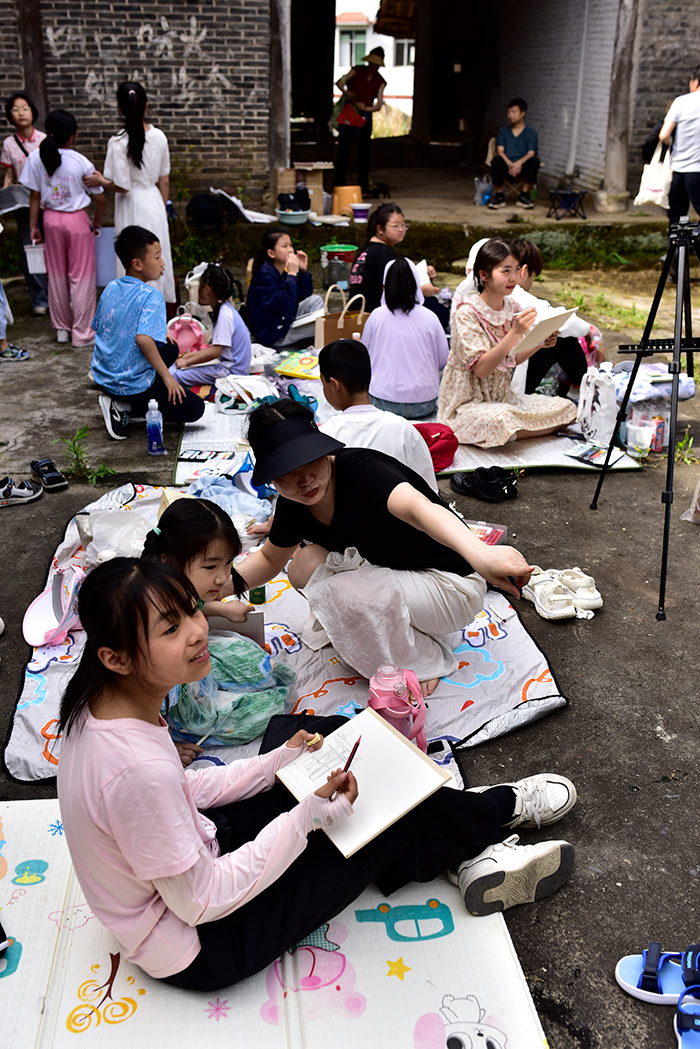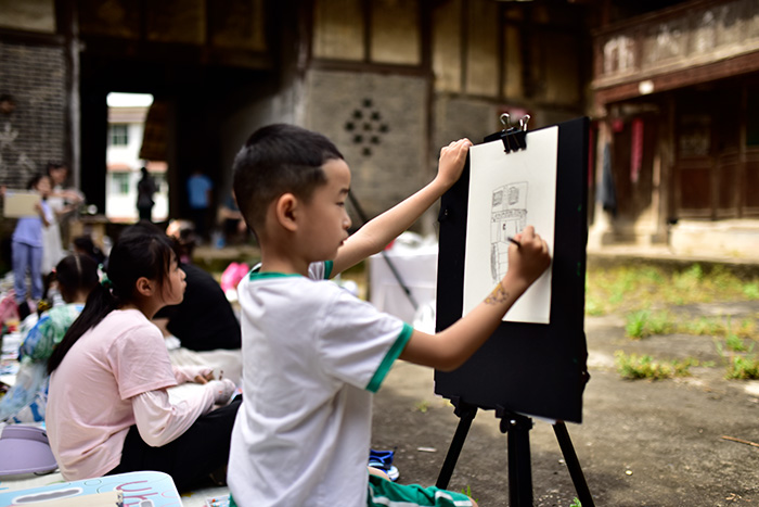 第二天,活动移师南部县川北传统院落——李家大院。孩子们在老师带领下参观古建筑格局、木雕门窗、青瓦飞檐,沉浸式感受川北民居的独特魅力。现场特别邀请艺术家何晋渭、西安美术学院研究生张云飞与江君泰进行户外写生示范。在三位艺术家的带领下,学生们架起画板、铺开速写本,以传统院落为主题展开写生创作。有人描绘院墙青石之厚重,有人描绘檐下光影的柔和,也有人自由发挥,创作出富有幻想色彩的“梦中庭院”。在文化与美的交融中,孩子们用画笔表达对传统文化的敬意与热爱。