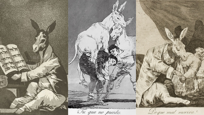 “驴”的意象成为贯穿龚若愚创作的核心隐喻。这一形象其实在艺术史中并不少见,给人印象最深的是弗朗西斯科·戈雅(Francisco Goya)的《狂想曲》(Los Caprichos,亦译为《奇想集》),他通过寓言中动物和夸张的角色来影射所谓文明社会中的弊病和荒谬,而戈雅笔下的驴常指涉那些缺乏独立思考、盲目追随权威或传统的人。