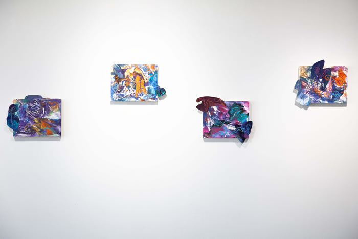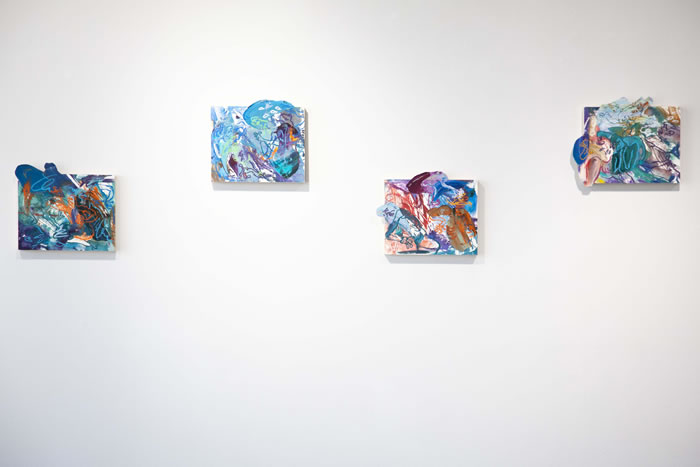 除此之外,他还通过拼贴元素进一步打破作品的边界:调色盘残骸被剪裁为不规则形状,转印复刻的亚克力版在肢解后被嵌入画面……龚若愚形容自己的创作为一种冥想与内观:“脑海中的场景就如同拼贴一样从来不是规则的,它的形状正契合了我的情绪边界。”