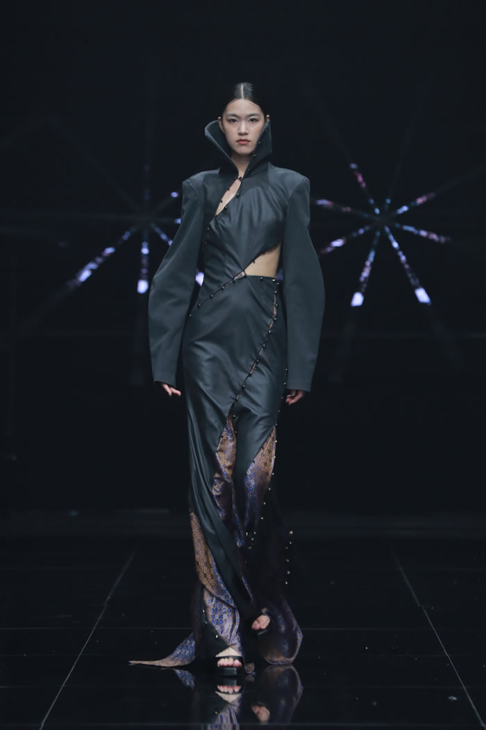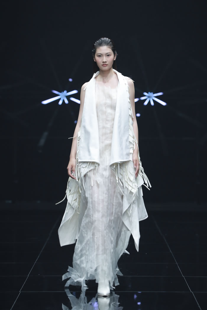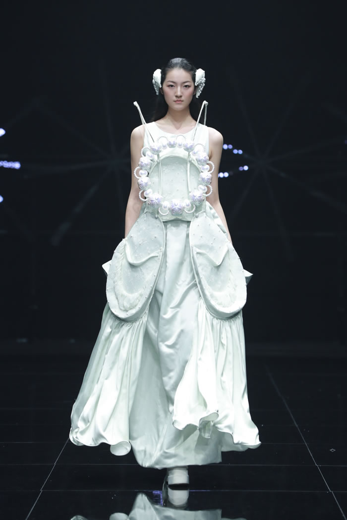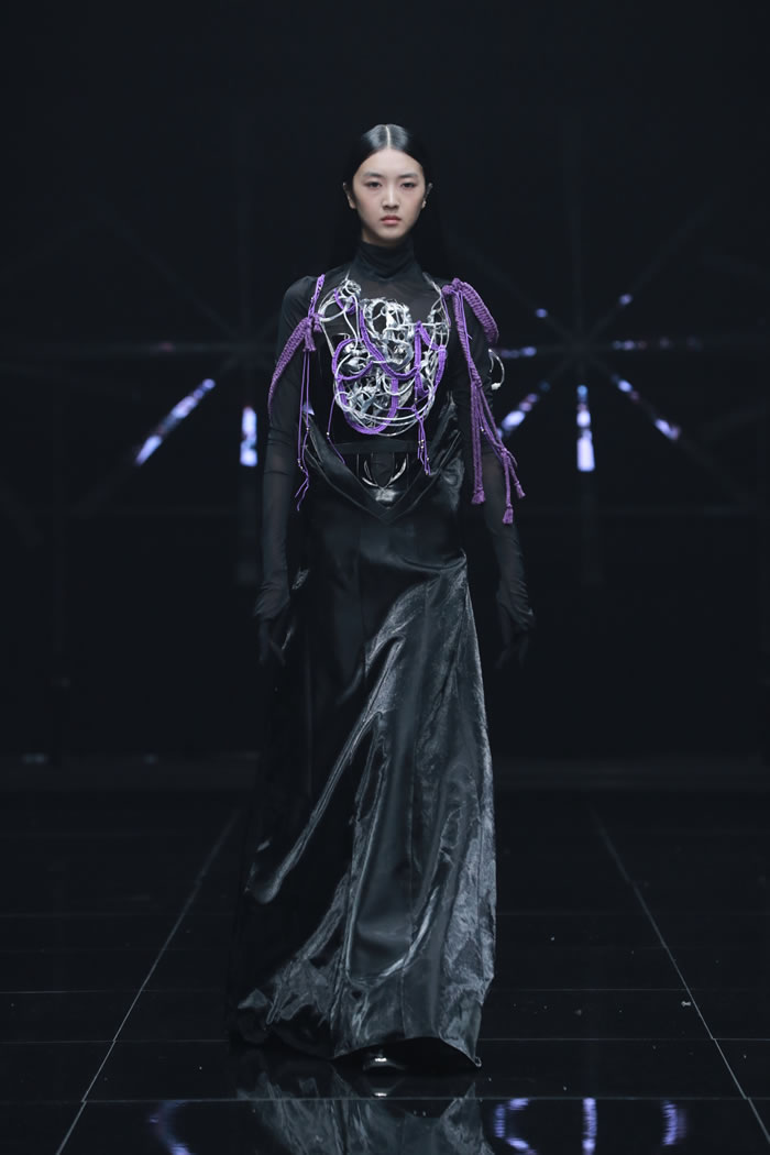在“重叠”的主题之下,同学们在材料选择与造型语言上大胆尝试,尝试建构一个融合传统与未来、现实与幻想、身体与精神的多维时尚世界。通过对文化、技术、生态与身份等议题的深入回应,彰显了新一代设计师以衣为媒,跨越边界、重构叙事的创作理念。一件件作品在舞台中交相辉映,给观众呈现一场精彩的视觉盛宴。