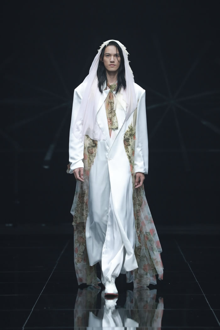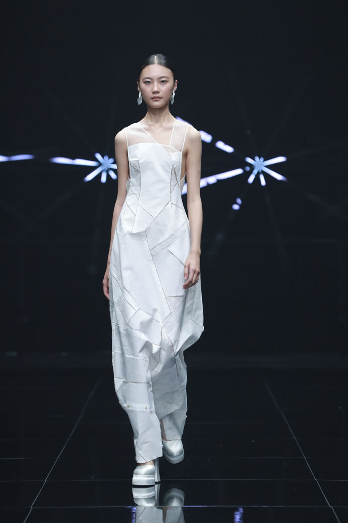 同时,还有一类作品围绕个体情绪、身份认同与社会议题创作而成。《自愈》表达在“绩效过劳”中寻求自我疗愈的细腻状态;《半夜下雪没人知道》用幻变的光影象征静默之中的情绪堆积;《观》以白色调与零浪费裁剪来映射内心想法;《回声》批判性呈现社交媒体时代下个体身份的异化与模糊;《浮光织影》融合缂丝技艺与正负形裁剪,打造兼具传统与现代的商务着装方案。