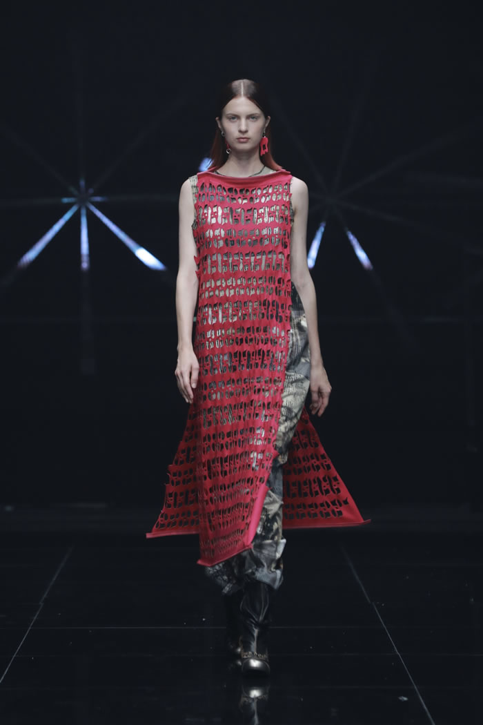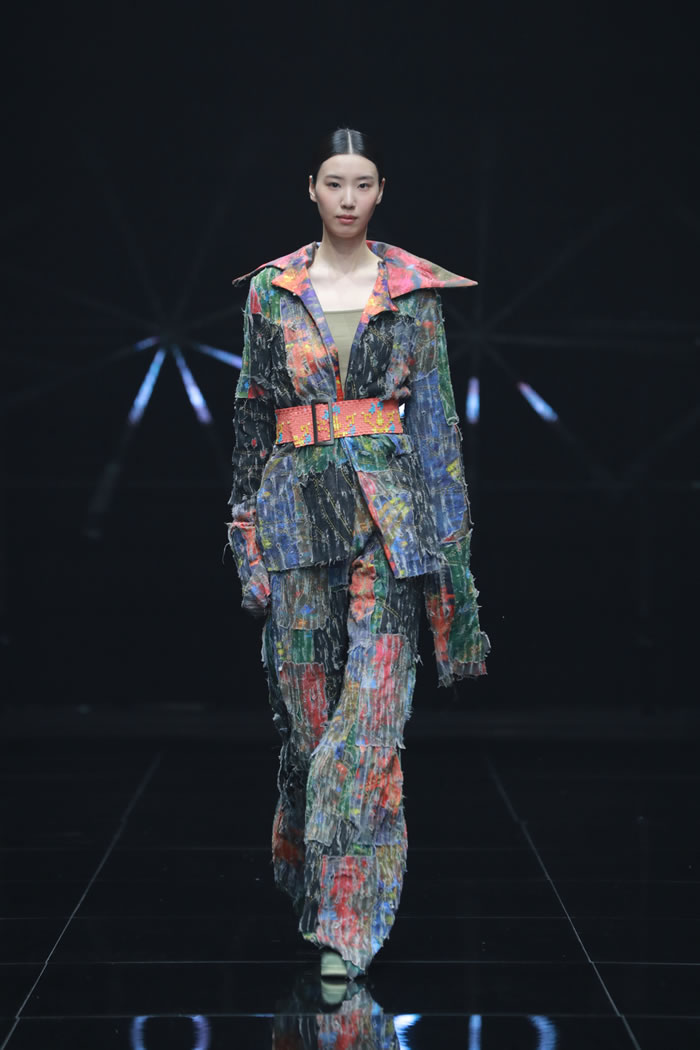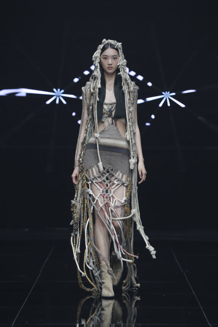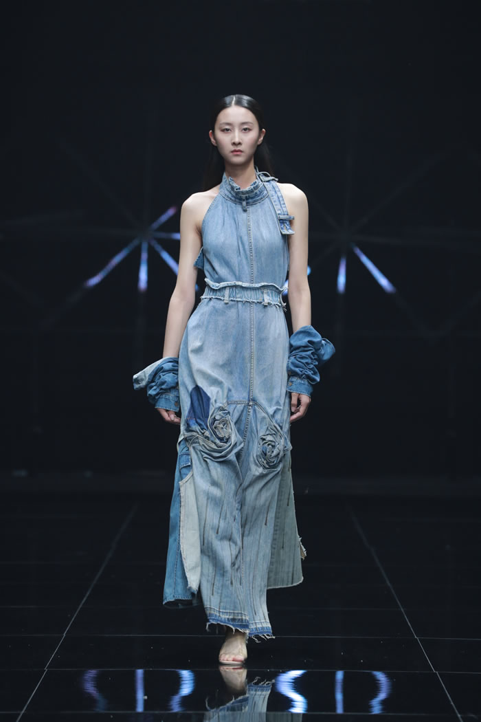 有些设计师也突破传统,将人工智能与数字媒介作为服装设计的创作工具。《自由频率》将摇滚文化视觉语言转化为服装设计的表达形式;《失序而治》借AI图像中的“失控参数”为灵感重组服装结构;《薪》则借助AI工具辅助,与消费者协同创作,结合个性需求与情感记忆,赋予旧衣新的生命,让旧衣蕴藏的情感以崭新的姿态延续;《物韧不息》以AI重塑棉质衣物结构的方案回答极端气候下的材料循环问题。