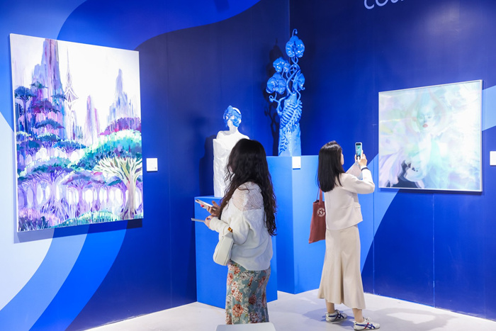 在《蛹变》中,费德洛娃将平面绘画、雕塑、立体光栅印刷、AR影像等多元媒介相互交织。观众不仅可以欣赏作品本身,还可以通过手机扫描画面,激活AR场景,从而延续画面中的故事。多媒体视觉叙事随着观众的移动变化而变化,打破了观看的单一性,也拓展了艺术作品的时间与空间维度,为观众带来前所未有的沉浸体验。展位现场,许多观众驻足欣赏、拍照互动,纷纷表示“像进入了一个柔软的数字世界”,“作品和身体在一起呼吸”。