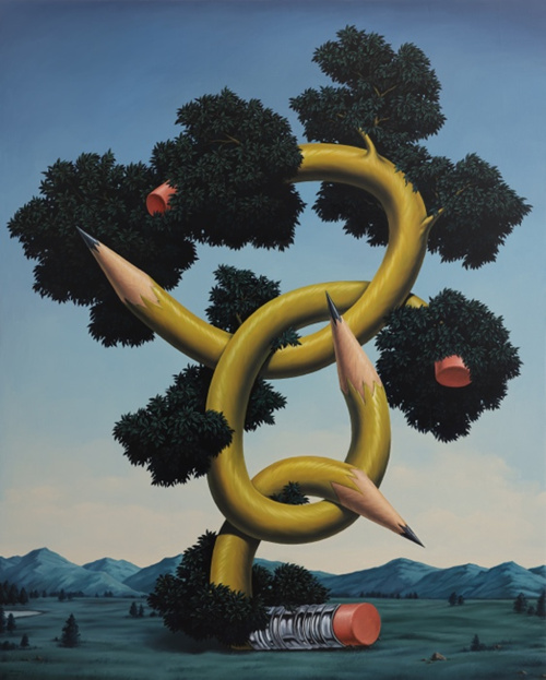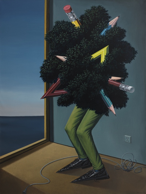作为一位以图像构造与观念转译见长的艺术家,周松在本次展览中呈现了多件绘画作品。他通过“人形树”“铅笔树”“扭曲蜡烛”等带有未来感与异化意味的视觉符号,在现实与虚构之间创造出一种既熟悉又陌生的图像秩序。展览不仅提供一种超现实的视觉体验,也邀请观众进入一个由自然、科技与信仰纠缠交错而成的精神地带。
