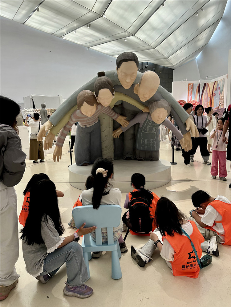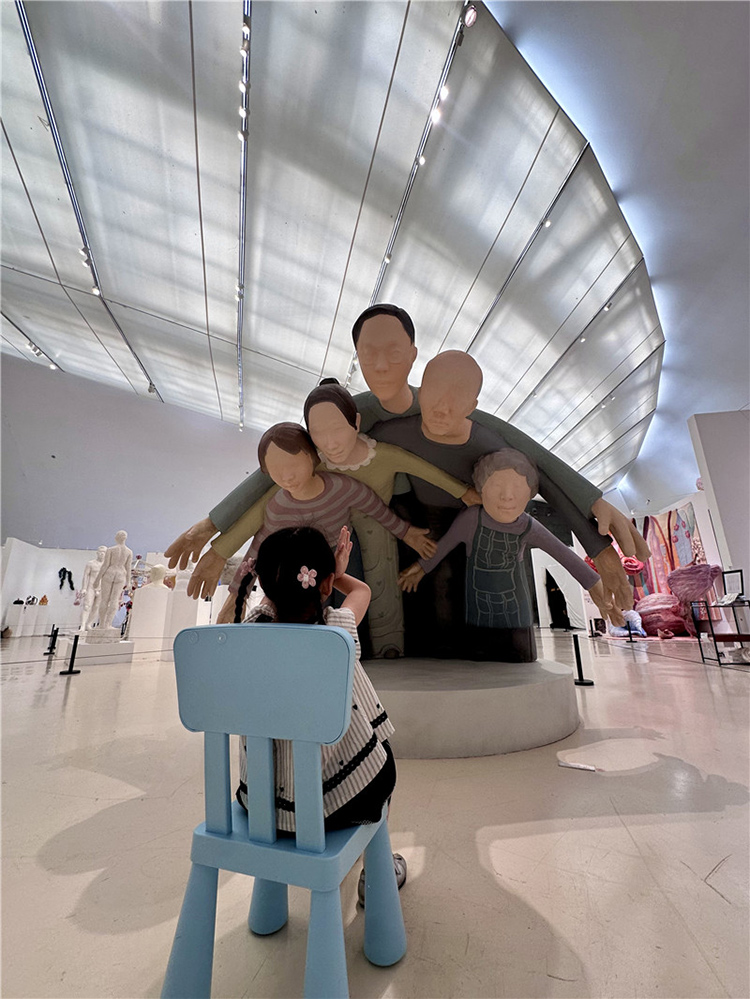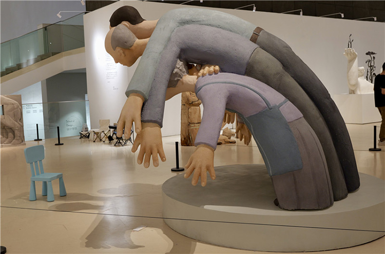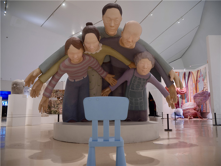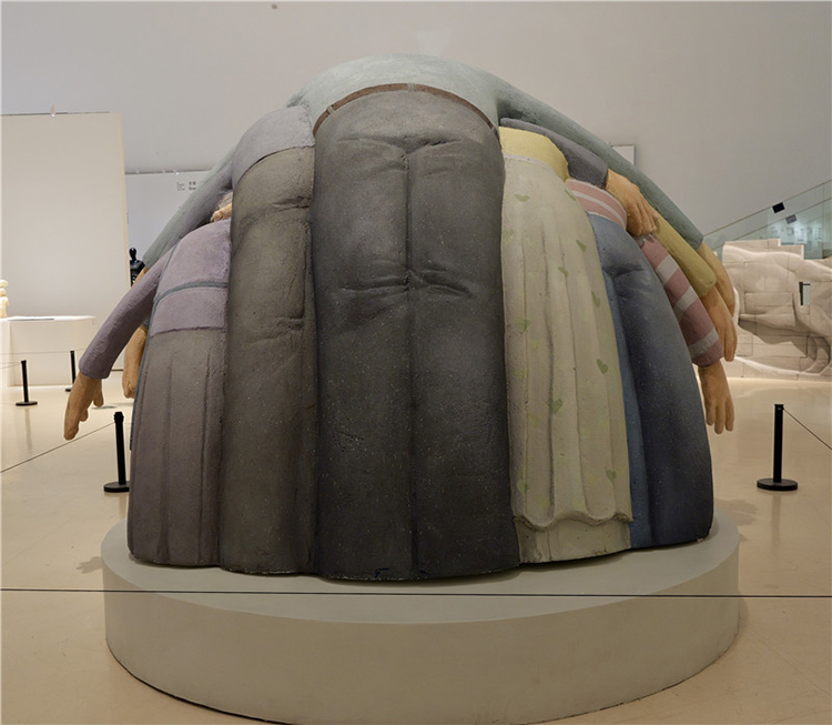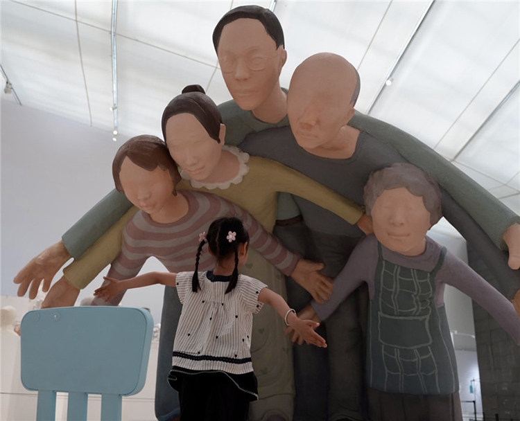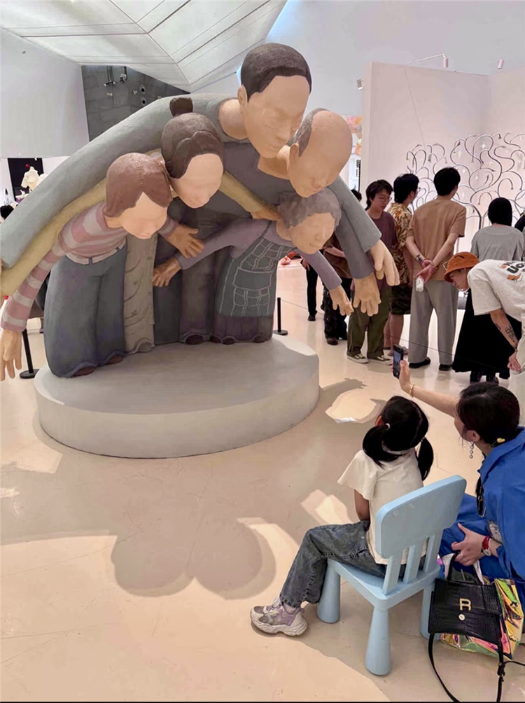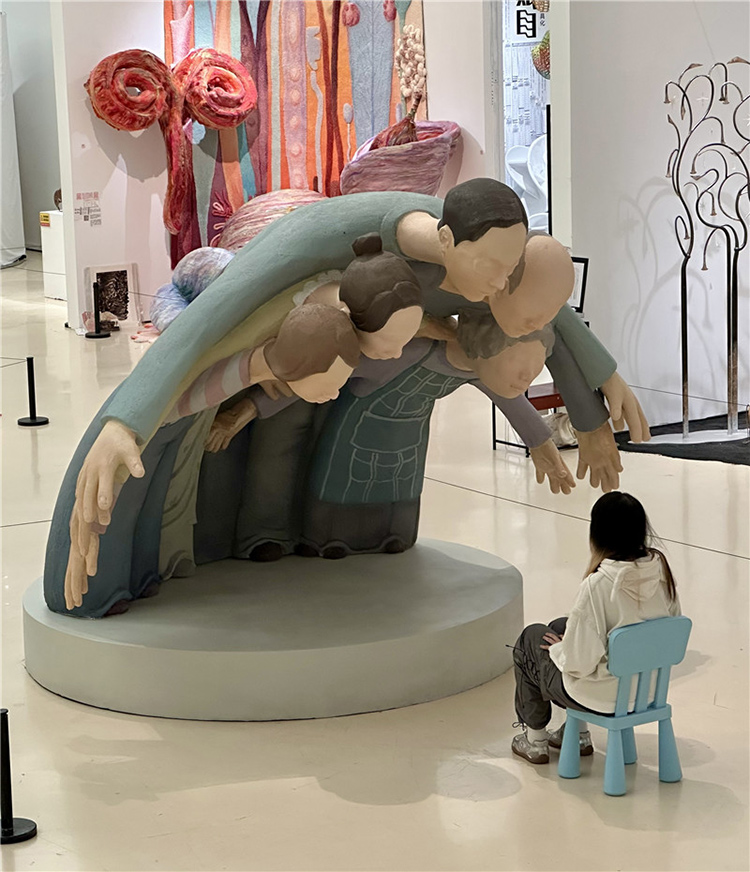 这件作品通过雕塑主体部分人物形象的手臂和身体相互重叠,形成了一种包围的效果,前方放置了现场品:一把蓝色的小椅子,观众可以坐在上面进行互动体验,整个作品给人一种强烈的视觉冲击和压迫感。作品中的人物形象代表了家长,他们以一种几乎要将中心人物(代表孩子)包围的姿态出现,象征着家长对孩子的期望和关爱。然而,这种关爱的强度和方式却让孩子感受到了巨大的压力,正如雕塑中人物形象的压迫感所表达的那样。雕塑中的蓝色小椅子则为观众提供了一个观察和体验作品的视角,它不仅是一个物理上的观看点,也象征着孩子在家庭关系中的立场。当观众坐在椅子上时,他们可以更直观地感受到被包围和压迫的感觉,从而更深刻地理解作品所探讨的家长与孩子之间的复杂情感。