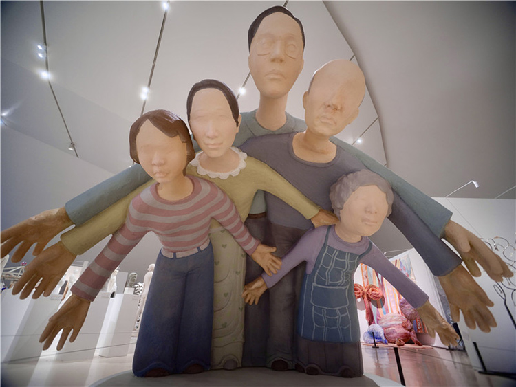 “最初,作品并非具体的人物形象,我想要隐晦地表达。我曾想过用一些代表成人的物品,如领带、西装等往下压,营造压迫感,但后来在与导师们的交流中,尤其是我的导师张伟老师指出,如果在石窟艺术中这种形式可能成立,但在一个没有背面支撑的场域里则不成立。于是,我决定直接以家庭的概念,用几个人物来表达。”