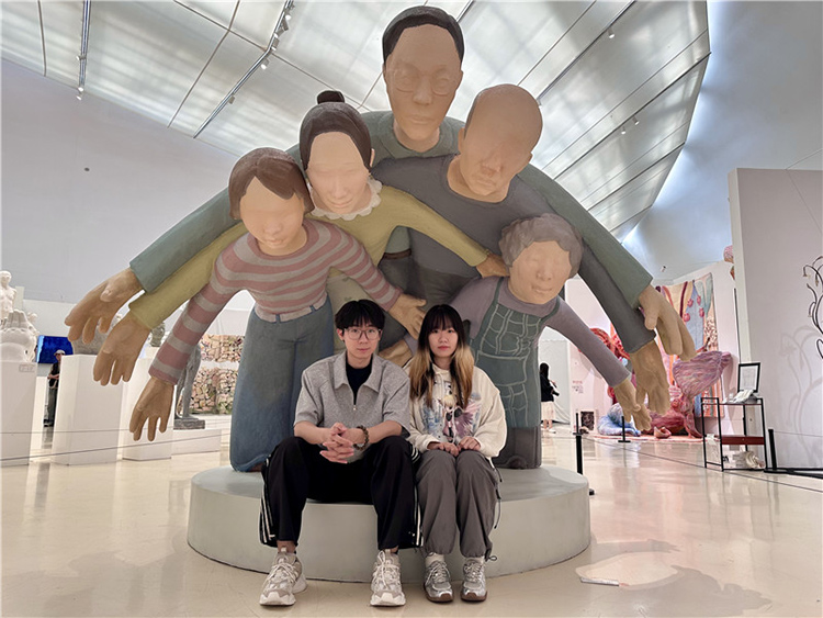 王健烨和姐姐与作品对视