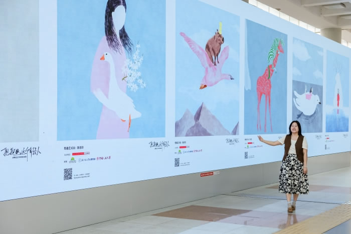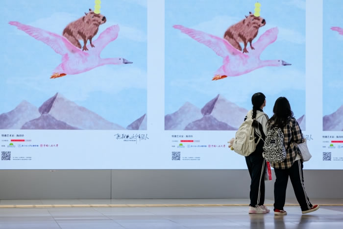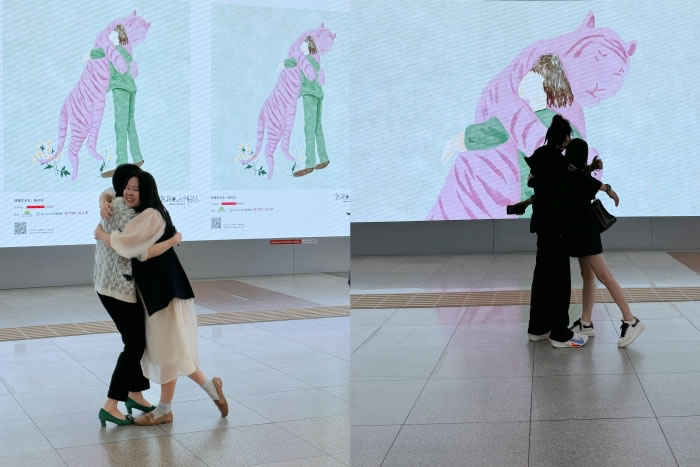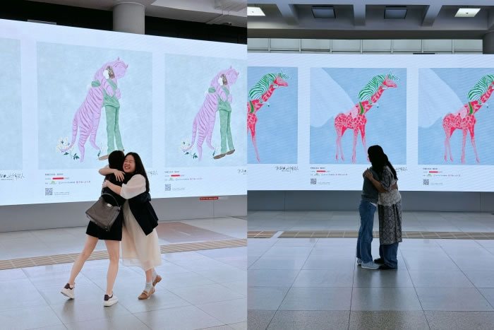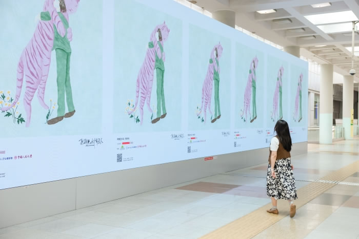 老虎、小熊猫、卡皮巴拉、长颈鹿、棕熊在艺术家的笔下变得柔软,他们拥抱着年轻人,拥抱着彼此。西直门站电子连廊变成了一个美术馆,步履匆匆的行人纷纷停住脚步,欣赏着艺术作品。