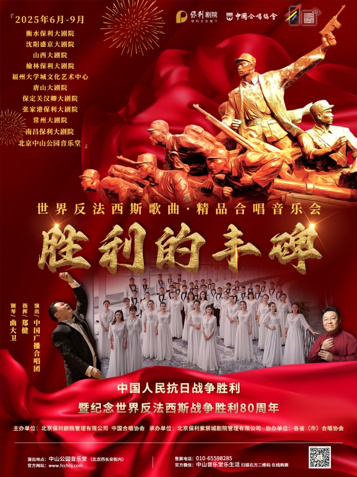 2025年,我们迎来了中国人民抗日战争胜利暨世界反法西斯战争胜利80周年这一意义非凡的时刻。为铭记那段波澜壮阔的历史,缅怀革命先烈的丰功伟绩,弘扬伟大的抗战精神与反法西斯精神,“胜利的丰碑——世界反法西斯歌曲·精品合唱音乐会”即将于2025年6月25日、26日在衡水保利大剧院上演,拉开本次保利院线巡演的帷幕。随后将于2025年7月至9月在北京中山公园音乐堂、河北唐山大剧院、保定关汉卿大剧院、沈阳盛京大剧院、山西大剧院、陕西榆林保利大剧院、福州大学城文化艺术中心、江苏张家港保利大剧院、常州大剧院、江西南昌保利大剧院等保利院线剧场轮番上演。