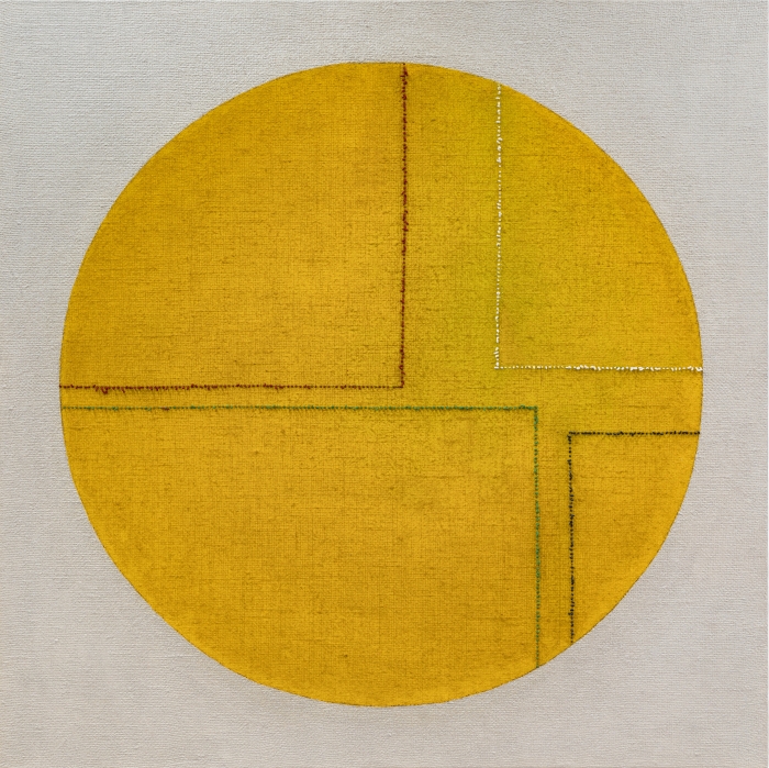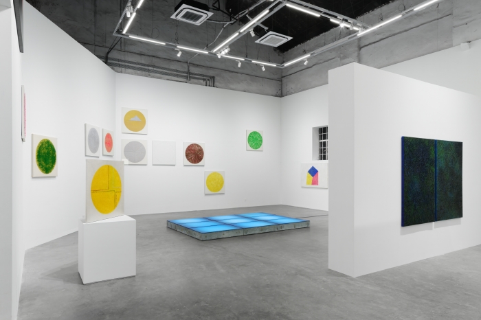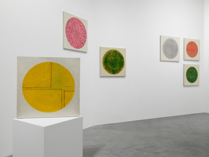 许是这份视觉上的通透,让观展的体验整体显得轻盈而愉悦。在这里,没有深奥的理论缠绕,也没有宏篇叙事的喋喋不休。轻盈体现在空间的通透,也体现在作品的小体量,更体现在颜料与亚麻布“缝隙”的摩擦与渗透后一种喷薄而出的自由。就比如《圆》系列的一幅作品,颜料看起来像是弥漫的苔藓,恰好我去看展那天是一个非常像黄梅天的黏稠雨日,所以当时看着这幅画就觉得这些绿色的“苔藓”在慢慢长出来,还会变得更加浓郁……还有一件《圆-A-003》,从正面看与背面看是不同的效果,这其实是让观众更好地了解申凡的创作理念——他把颜料从画布背后往前挤,这样从前面看挤过来的颜料就有一种立体的浅浮雕效果,让人想到孩童时代玩泥巴的体验。确实,申凡对待颜料的创作方式颇具“游戏”心态:他在正方形的画布上用各种方式圈出一个周正的圆形——用油画刮刀砌平颜料砌成圆形;用钻出来的孔围合圆形;还有把颜料涂抹在画布背面而任其在外力作用下渗透画布的经纬线而另一面生长出来……于是,平面的画面打开了空间;当这些画作被置于固定的空间后,空间中的空间叠加了;它们亦随着观者的脚步或视野的移动而有流动,由此而知,好作品的能量往往自由生长而又彼此连接的。