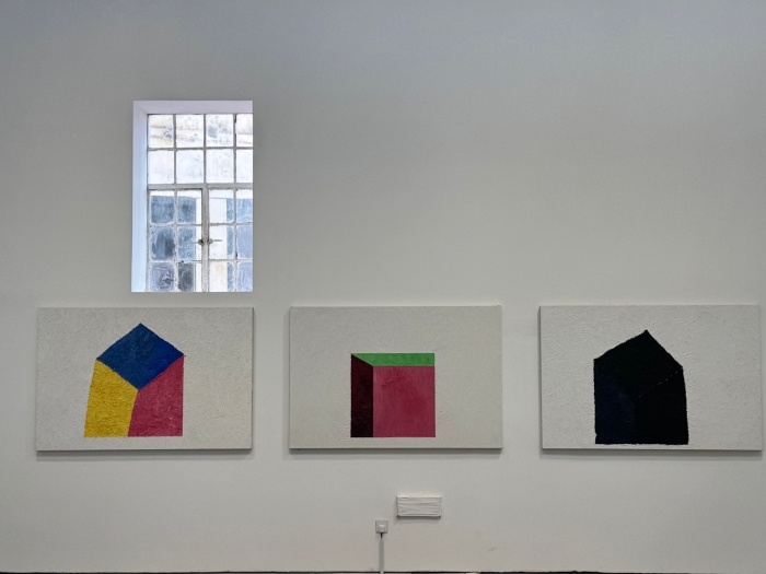 展览标题“我没有我”出自艺术家的自白,直指申凡的创作核心——通过消解传统表现主义所依赖的“自我”,实践一种褪去绘画手法的表现、抵达天真烂漫精神的“无我”状态。在如此盛名和业内认可的成就之下,这场看似会流于“回顾展”思路的展览却打破了时间线性叙事,且大部分作品即便不是新作但也是首次公开展出;策展人还特地将2025年的新作与上世纪90年代的作品并置,打破时间维度和艺术史叙事脉络,以作品本身和现场空间说话。于是乎,展览的主题和策展定位就消解了一种如同时间档案的沉重感,加上香格纳M50空间为这次个展特地在原本封闭的墙上打开了一扇窗,与展厅内的作品有了种种巧妙的呼应——不仅在于窗的弧度和画布的弧度呼应、窗之几何形与画面的几何形呼应,还在于与地面上的装置作品《天空》呼应,真实的天空与经由镜头摄取以及装置转译的天空之对比,真实与虚拟或许已经不再重要。而整个空间似乎都变得抽象、或者说充满了诗意;这个让很多人再熟悉不过的老空间,因为这个新展,焕发了新生的面貌。