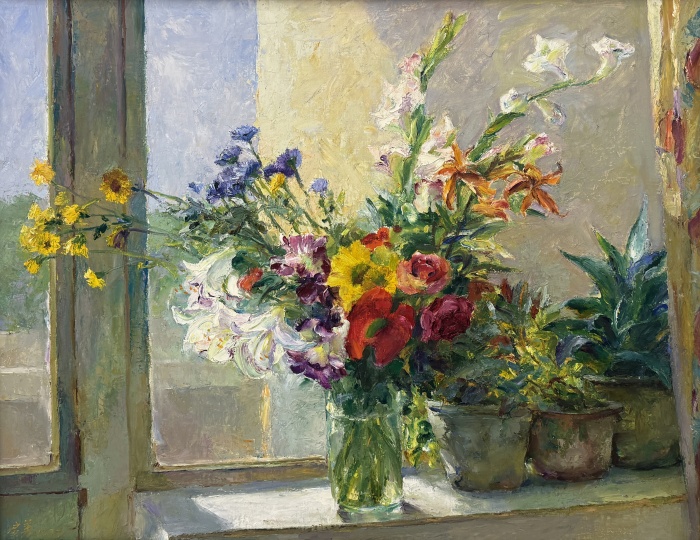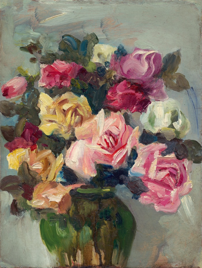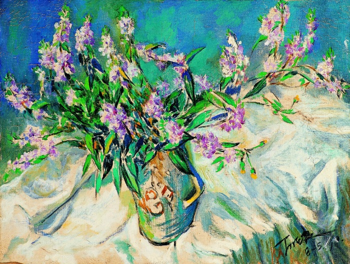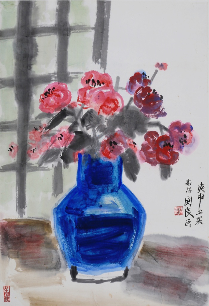 关良是融汇中西绘画的大师,静物也是他重视的题材,《月季花瓶图》吸取了油画的笔触和塑造方式,色彩单纯绚烂,融入了墨色和环境色。花瓶与花朵矗立正中,展示出怒放的生命力,背后的窗外,则是生机盎然的绿色和希望。