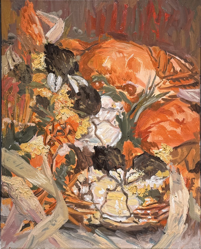 在中国绘画和诗歌体系中,“物”有丰富的寓意,某些花卉因为其纯洁性质,代表了美好的祝福;“蟹”与“谢”同音,表达出图像之外的双关含义。倪军的作品用特写式的近距离观看,描绘带有特殊意味的物,给纯正的西方油画语言注入了文人画的精神。