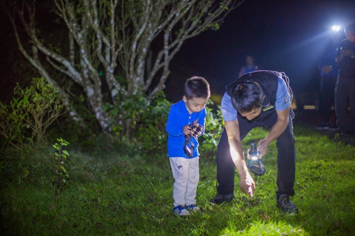 当这场流动的课堂向北延伸42公里,在暮色渐沉的普洱太阳河森林公园里,一群手提柔灯的小小探秘者正跟着森林体验师的脚步,在蕨类植物垂落的绿帘间穿行。月光透过树冠洒下斑驳的光影,照亮了绞杀榕的生存智慧,也叫醒了夜色中的点点萤火。他们的行囊里装着刚采集的刺栲果实,衣襟上沾着不知名的野花瓣,认真地寻觅昆虫的踪影,而林间的风正悄悄记录着这场与自然的对话——当城市霓虹亮起时,这里的生命正以另一种方式苏醒。