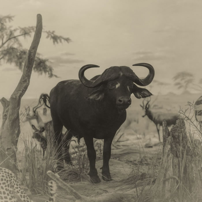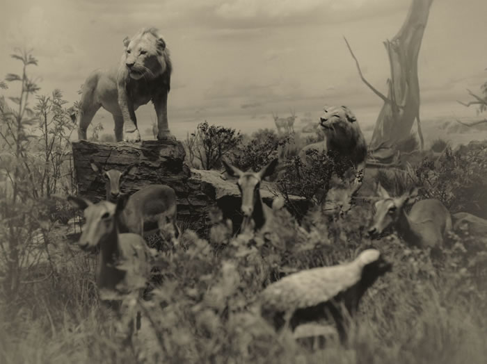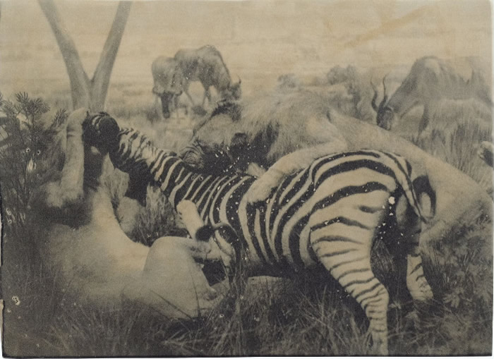 在创作手法方面,林世豪对构图与光影的把控精妙绝伦。他精心设计画面结构,巧妙运用戏剧性光线,将动物标本转化为承载哲学隐喻的视觉符号。通过明暗对比勾勒标本轮廓,凸显生命消逝后的“永恒姿态”;借助对称构图赋予标本仪式感,以此类比生命轮回的秩序。例如,2025年2月14日创作的铁银印相作品中,羚羊标本与自然背景和谐交融,柔和而有力的光影仿佛在诉说着生命虽逝,却以另一种形态融入自然、获得永生。这种创作方式促使观众在欣赏作品时,不自觉地深入思考生命形态的“静穆与永恒性”。