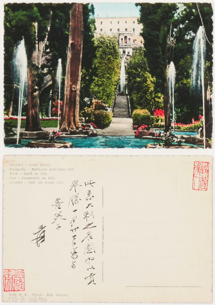 说明:上款为张大千之日本红颜知己山田喜美子。此为张大千游览意大利时明信片,意在将此风景与情人一并赏析,直可视为情书。明信片中风景为罗马周边小镇帝沃利(Tivoli),如大千所说,“以喷泉胜”。张大千与山田喜美子结识于日本,时在解放后,经日本裱画店黄鹤堂主人介绍。张氏曾赠予山田多幅画作,并以其为对象作诗、作画。二人之交往曾为张氏提供诸多灵感。