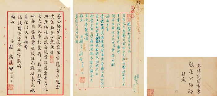 说明:此件为20世纪40年代末杜月笙致信已在台湾之顾祝同(陆军总司令、国防部参谋总长),转由陆京士(1907-1983)带去问候,并介绍了自己近期的身体状况。另附顾祝同秘书程大千所拟回函,上有顾祝同批示。