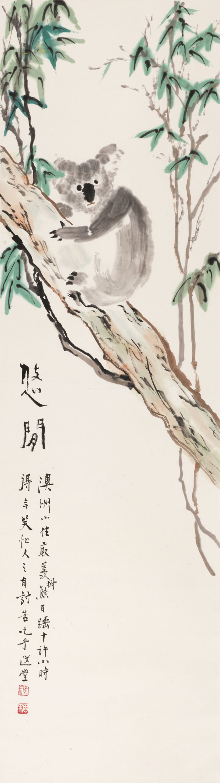 款识:悠闲。澳洲小住,最羡树熊日谁十许小时,得无笑忙人之自讨苦吃乎,选堂。