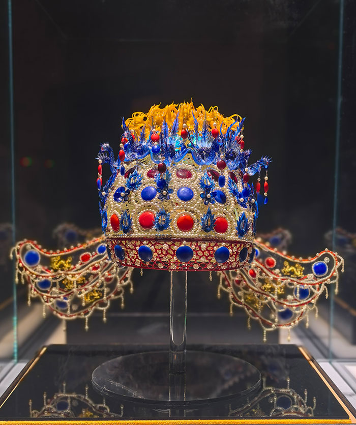 展览第二单元“幻彩永驻”重点呈现了现当代琉璃工艺美术师通过吹制、脱蜡等热成型工艺及内画、雕刻等冷加工工艺制作成型的炫丽多彩的琉璃艺术品。有些作品将琉璃材质的“仿真性”发挥到极致,现场可见不少以琉璃制作成的花卉、蔬果、动物、山石等中国传统观赏类景观,造型逼真,色彩艳丽,栩栩如生;有些作品则将琉璃作为综合材料的一部分,体现出现当代琉璃艺术的先锋和实验意识;还有的作品致力于向传统致敬,复刻经典。展览现场,3位95后艺术家孙启烨、邹宇曦、陈玙强以国家博物馆所藏既承凤冠为原型,几乎等比例复刻的琉璃作品《琉璃凤冠》吸引了全场目光。作品中所有可见材质全部以琉璃采用灯工和编织工艺制作加工完成。