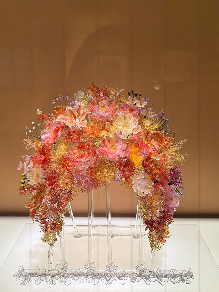 灯工技艺是琉璃热成型工艺之一,利用琉璃的热塑性和可熔性特点,以多彩的料条为原料,通过加热、塑形、粘接等创作出美轮美奂的琉璃艺术品。现场展出的《十二花神系列》、《蝴蝶灵蛇花冠》等灯工琉璃作品展现出创作者对造型美学的极致把控,观众亦可以从每件作品中品味到“火中取艺”的惊险诗意和现代琉璃灯工技艺的精妙绝伦。