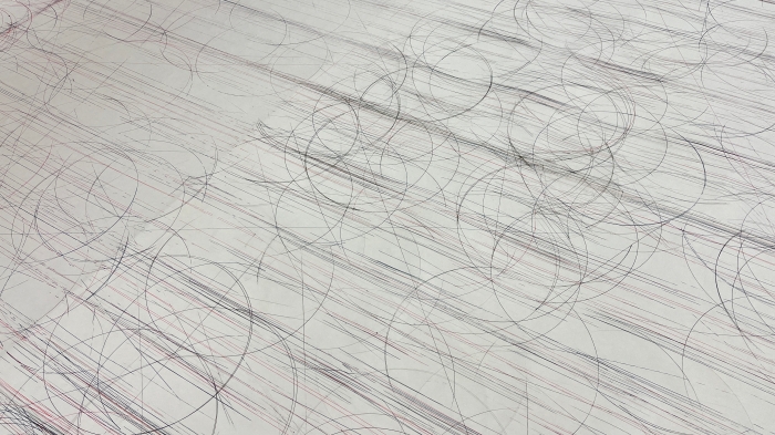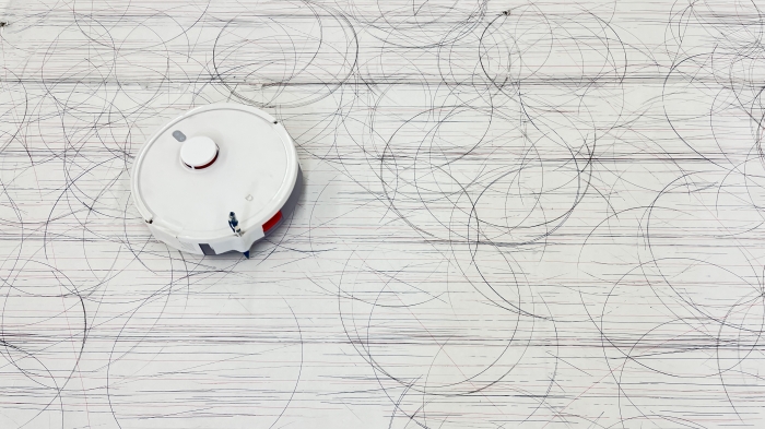 展厅中那个绑着笔的扫地机器人作品《无尽线》,则以机械的无限运动模拟了头发自然脱落与生长的生命循环。机器人不知疲倦地画出的线条,既是对人类发丝形态的模仿,又是对非人类时间感知的想象。这件作品巧妙地提出了关于时间体验相对性的问题:机器感知的时间与人类感知的时间有何不同?当人类试图用机械记录时间时,我们是否只是在创造另一种形式的生命痕迹?那些看似杂乱的线条,实则是对头发这一生命标记物的机械重演,两者共同构成了关于时间物质性的双重证据,在机器人和人类之间身份之间设定的规则让二者模糊了身份而每次的规律画线走位让人类从他者视角再次观看自我本体的生存状态。
