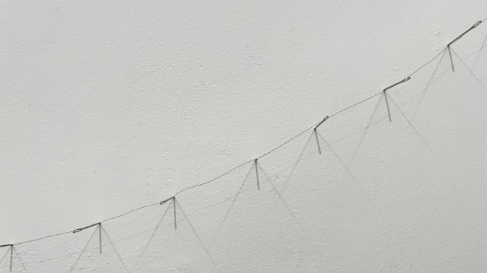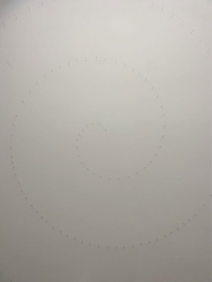 在《千钧一发》这件作品中,艺术家将自己的头发连接成螺旋状长线的作品,则将这种时间物质性推向了更为极端的表达。这根长发贯穿了上百枚钢针,既是对时间线性前进的模仿,又是对这种线性叙事的颠覆——螺旋形态暗示着时间的循环与往复。这件作品令人联想到每个人成长的中所遇到的种种困难,每一厘米的发丝都凝结着特定时刻的身体状态与心理境遇,只有闯过这些困难才能换来个人的蜕变。整件作品用发丝的轻盈和钢针的尖锐形成强烈反差感更是启示出柔与刚的辩证关系。