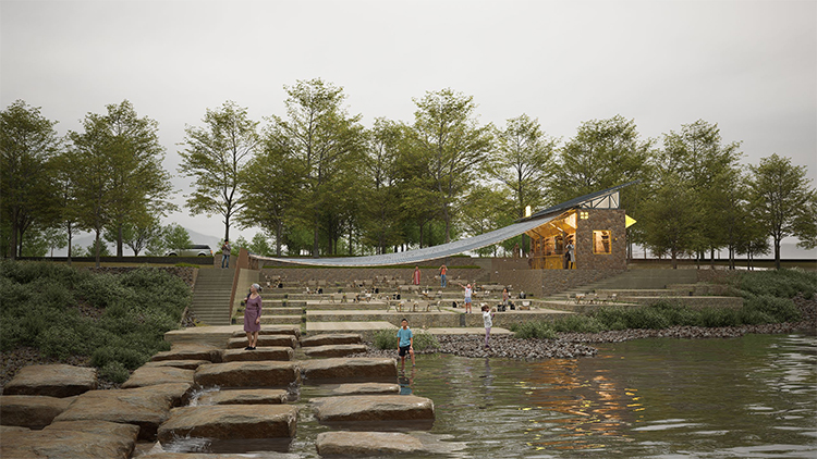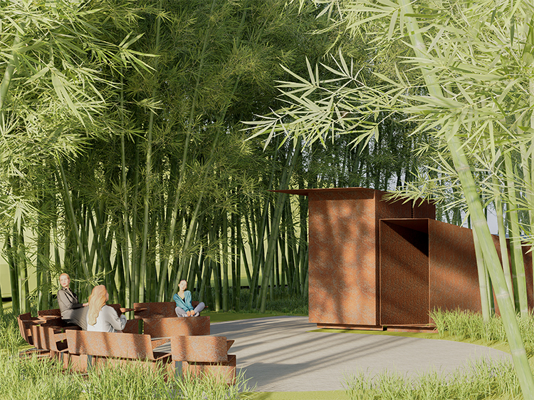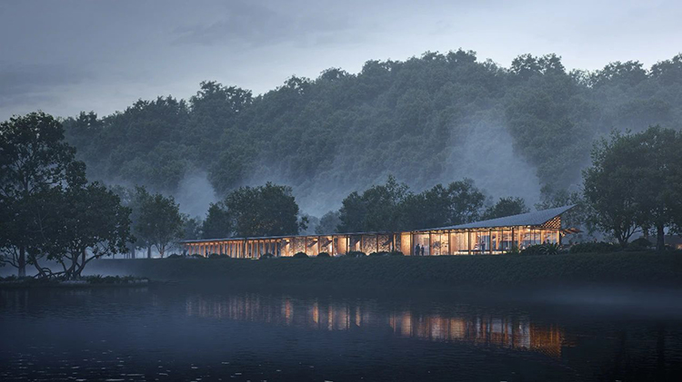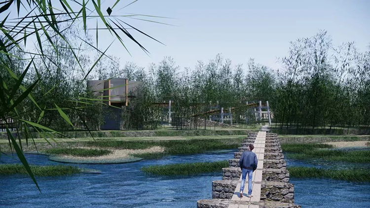 设计最大程度退让已有江堤和原生林木,以装配式钢木结构为骨架,搭配毛石,片岩瓦等当地材料,与场所环境的先来者“共营”、“共建”、“共生“,再现东坡先生笔下的柳荫堤岸闲行处。
