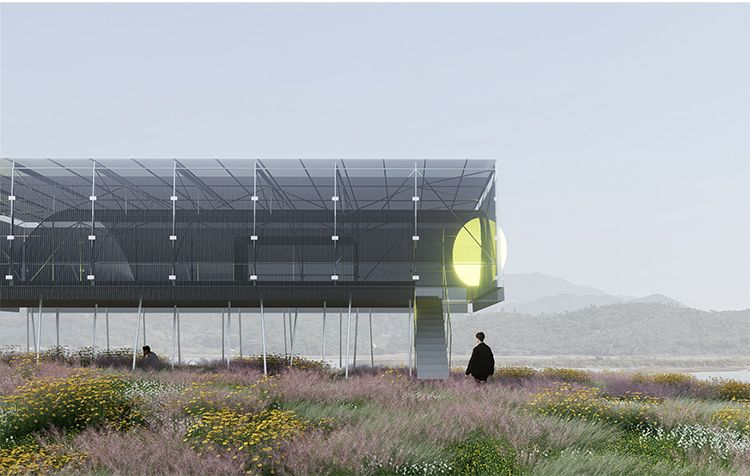 底层架空让岛即是花园变得完整,由随机排列的细钢柱支撑的建筑以轻盈的姿态悬浮于花园之上,混凝土如同抽象的船底,上部轻质的钢结构保留的原花房拱形构架,庇护空间里的人,空间的核心是“双月”并置:立面南北两侧各有一轮可转动的明月装置,分别朝向村落与水库随机转动,与现实中的月象呼应。当访客沿楼梯步入原花房屋顶中,乌篷下的拱形框架将视线引向远方——天幕中的真月、立面的幻月与水中的倒影在此交叠,举杯追问“明月几轮?”。