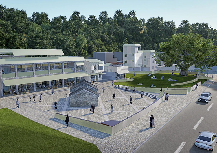 榕下听音(千年古榕驿站)是由建筑师刘可南打造的“东坡乐事”主题驿站。设计在千年古榕下的这块历史悠久而鸡犬相闻的场地上展开,将场地上断裂的各种元素和空间关系修补再次链接:通过弧线景观墙将古榕树和村口老大门调和成村口景观系统;用轻钢挑檐把古榕边三个小楼连成一个整体,成为景观系统的主要界面;再为这三个小楼量体裁衣,置入新的功能,助力它成为老社区的活力中心,也成为在地村民和游客共娱的空间舞台——古榕的年轮藏着岁月的故事,新置的功能载着当下的烟火,终成了以声传心、以景会友的知音之地。