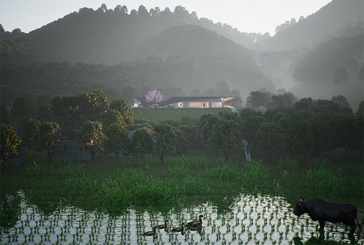 三个坡屋顶建筑体量通过灰空间(过渡空间)的屋面实现有机连接,自然融合成一道流畅的曲线屋顶景观。屋顶下落到地面可供人们休息处一棵风铃木穿过屋面,实现月下闻箫的画面感。各灰空间的设计还充分考虑了观景需求,让身处其中的人们能够远眺峡谷农业生产景观。
