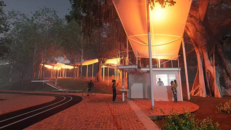 风袂驿是众建筑的建筑师臧峰携手艺术家徐子薇、位昂打造的“东坡乐事”主题艺术场景。这里是轻扬、休闲、舒适与动感的一组公共空间,是“衣袂当风的驿站"。密林中的屋顶,如被随手脱去飘扬的衣衫,被微风轻轻吹起的轻纱,在林间飞扬,舞动。材料选择膜材与细钢丝,形态轻柔多变,邀请人们放下生活中的繁重束缚,感受运动与自然带来的宁静与自由,以放松的状态接待来客。