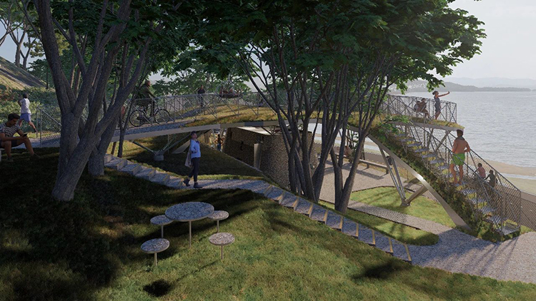 凤谷驿是建筑师陆嘉鸿携手艺术家 Chaosteria 打造的“东坡乐事”主题艺术场景。凤谷驿藏身于水库湖畔的山坡台地间,如传统道旁茶棚般轻盈栖居,五指状的观景挑台从林间探向水面,将水库风光尽收眼底。棚顶覆土与山林绿意相融,棚下提供咖啡休憩等便民设施,让旅途更惬意。单车路径蜿蜒穿梭,引导骑行者自由探索台地与山林,感受运动与自然的和谐共鸣。这里不仅是休憩点,更是一处承载温情、拥抱风景的所在。