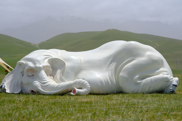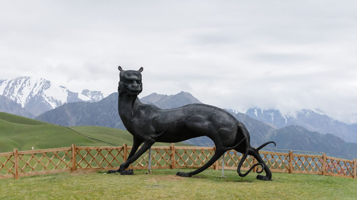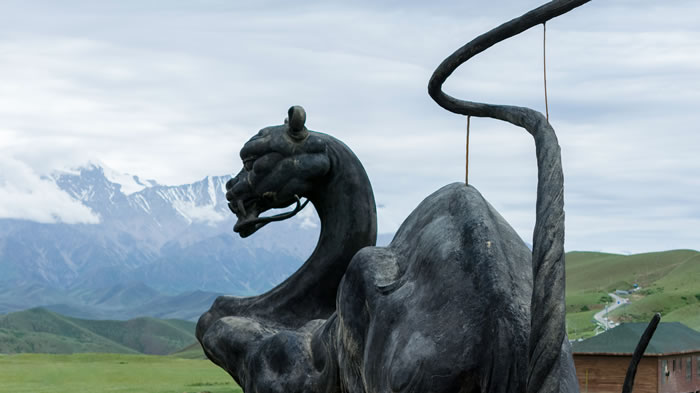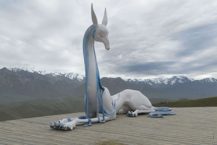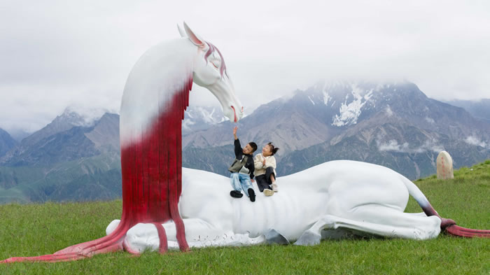 沿着昆仑景区广袤自然风貌分布的20多件山海经神兽置身于草地、步道间,以雪山为友,与白云为伴,营造出了移步易景、处处皆不同的特殊地域文化场景,并通过神兽雕塑向人们诠释中国传统文化中东方哲学与智慧。