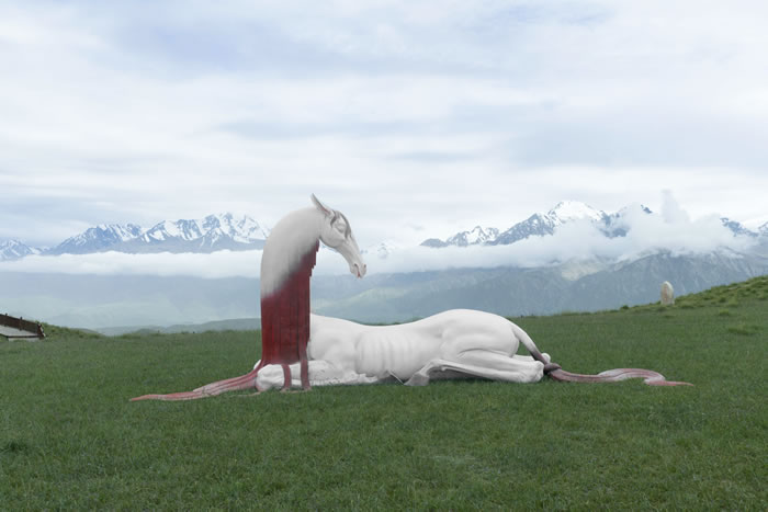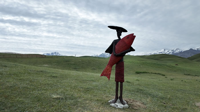 正值新疆策勒昆仑山白昼热烈、夜晚澄明的盛大旅游季,艺术家邱启敬携四十余件由《山海经》古文献创作而来的大型雕塑作品,呈现于新疆和田策勒昆仑山。
