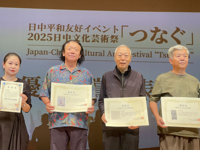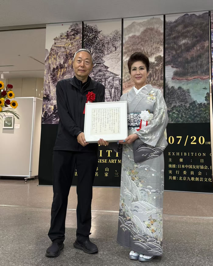 开幕式现场,主办方日中国际艺术家协会川阪实由贵会长为参展艺术家李翔、王界山、张鹏颁发“国际文化交流贡献奖”证书,表彰三位艺术家在推动中日艺术对话中的积极作用。同时,展览还举行了作品收藏仪式,三位艺术家的代表性作品被日中国际艺术家协会正式收藏,成为中日文化交流的珍贵见证。
